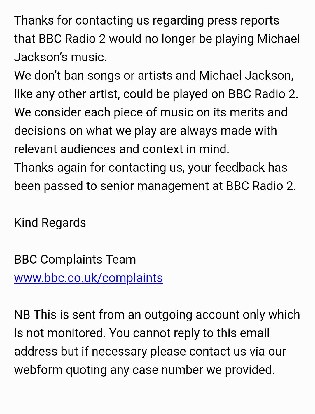 Dziękujemy za skontaktowanie się z nami w sprawie doniesień prasowych na temat tego, że Radio 2 BBC miałoby już nie grać muzyki Michaela Jacksona.